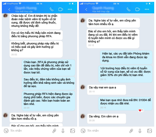 Phòng khám đa khoa An Bình đã tiếp nhận và điều trị thành công cho nhiều trường hợp bị mắc bệnh viêm lộ tuyến cổ tử cung. Nhận được phản hồi tích cực từ phía bệnh nhân: