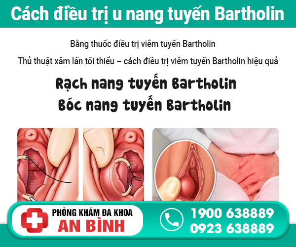 -Điều trị can thiệp áp xe bartholin có nhiều phương pháp khác nhau. Trong đó có: Bóc tách, chích áp xe bartholin, phẫu thuật cắt bỏ tuyến bartholin, rạch và dẫn lưu cho thoát dịch rồi khâu kín miệng tuyến,…Các phương pháp trên cho hiệu quả khá tương đồng nhưng hiện tại thì chích áp xe tuyến bartholin đang được ứng dụng rộng rãi nhất.