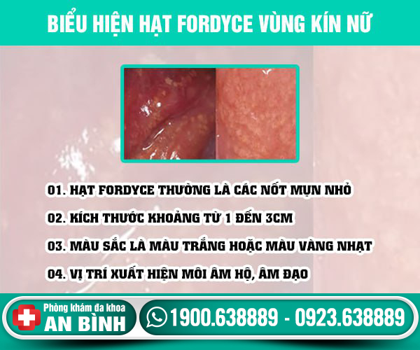 Trên đây là những thông tin có liên quan đến tình trạng hạt fordyce ở vùng kín nữ. Nếu còn bất cứ băn khoăn gì hãy vui lòng liên hệ với phòng khám thông qua hotline 1900 638889/ 0923.638.889 sẽ được tư vấn miễn phí 24/7. Hoặc trực tiếp đến phòng khám đa Khoa An Bình để thăm khám và chữa trị bằng phương pháp tân tiến.