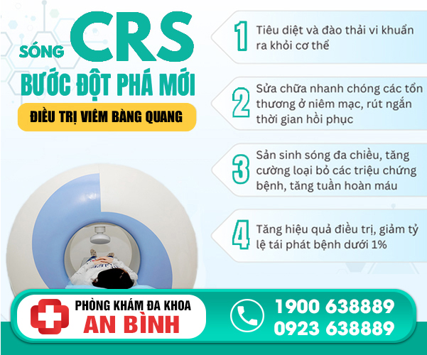 Phương pháp CRS được cho là kỹ thuật trong điều trị bệnh viêm bàng quang mà phòng khám đa Khoa An Bình đang áp dụng. Kỹ thuật này sử dụng máy móc, công nghệ mũi nhọn để phát hiện đúng nguyên nhân gây bệnh. Sau đó, chiếu chùm tia ánh sáng quang học có cường độ mạnh vào vùng viêm nhiễm để loại bỏ vi khuẩn, giảm đau, tiêu viêm. Ánh sáng đủ cường độ nên không những không gây bỏng mà còn đạt hiệu quả vi khuẩn.