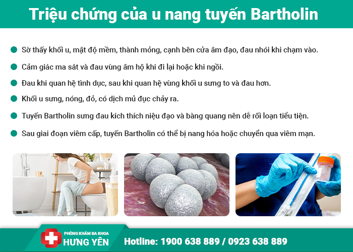 Khi các nang tuyến Bartholin nhỏ, thường không xuất hiện triệu chứng và ít gây đau. Tuy nhiên có tình trạng này nhiễm khuẩn và hình thành áp xe, các triệu chứng có thể xuất hiện như: