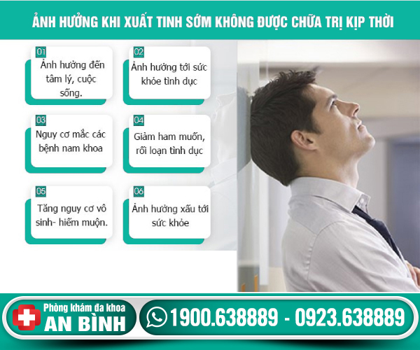 Tình trạng xuất tinh sớm nếu không được can thiệp, xử lý kịp thời sẽ gây ra những hậu quả khôn lường. Chính vì thế, đến gặp bác sĩ chuyên khoa thăm khám sớm là điều cần thiết.